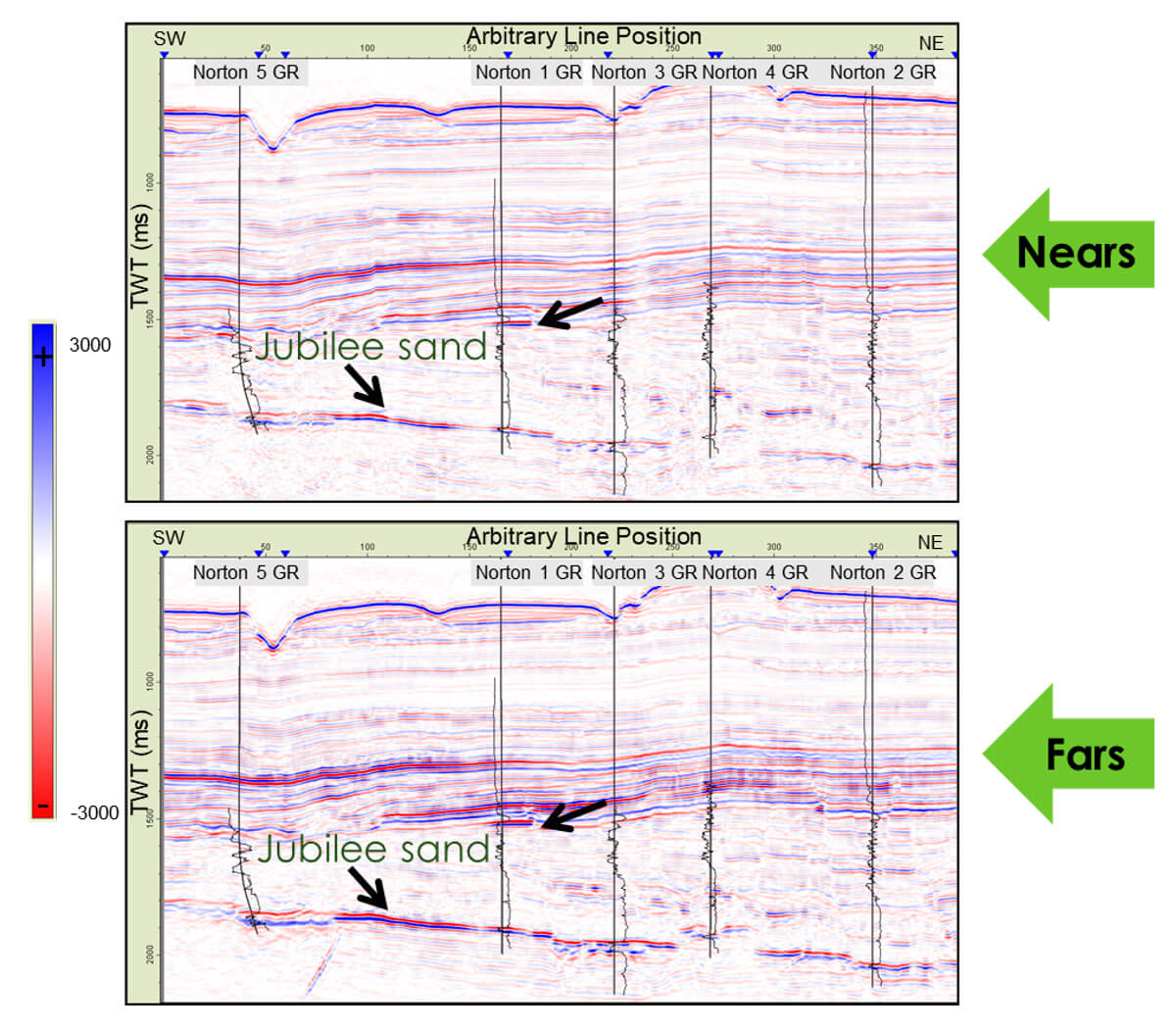 The arbitrary line shown in Figure 10 connects the five well locations. The Jubilee sand is our main reservoir; it has a low gamma-ray signature and porosities in the mid 20’s percent. We can see a strong trough at the top of the Jubilee sand. The seabed peak indicates that we are dealing with SEG (North American) normal polarity where a peak corresponds to an increase in acoustic impedance. Another important amplitude anomaly is observed in the well Norton 1 (indicated by a black arrow in Figure 10). This anomaly represents hydrocarbon-bearing sand at this location. Aside of Jubilee and Ranger sands, the rest of the section is largely shale. There are seismic artifacts related to the presence of a seabed canyon located around the Norton 5 well. These artifacts include an amplitude washout in a vertical strip below it and multiples at the base of the section.