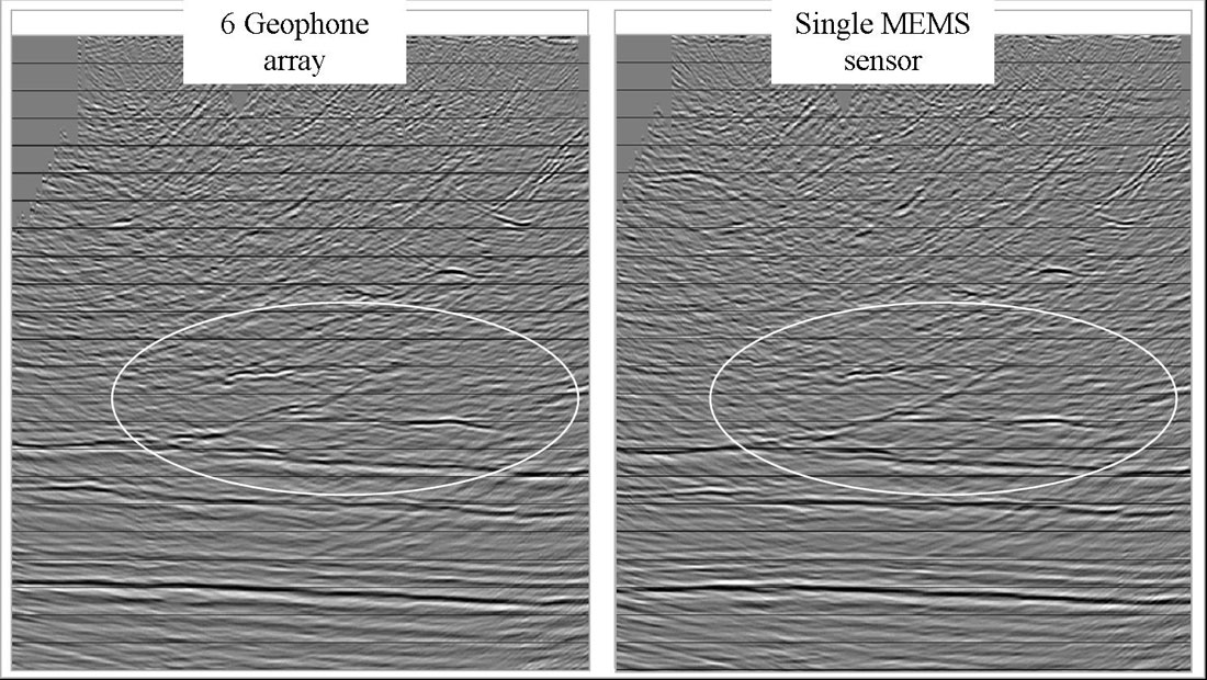 Figure 9 shows improved P-wave data quality from single-sensor 3C MEMS seismic data compared to geophone arrays. Two 2D seismic profiles are shown. Section A is recorded using conventional geophone sensors deployed as 6 element linear arrays over 20m. Section B utilized a single 3C MEMS sensor centered on the geophone arrays. These 2D profiles traverse a steeply dipping thrust. The faults and steeply dipping base of the thrust are better imaged using the single-sensor 3C MEMS sensors.