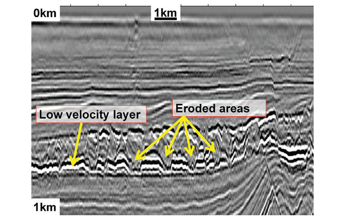 The first example considered here is from deep water offshore Sri Lanka (Stevens et al., 2014; Fruehn et al., 2014), where the sea floor is incised with deep canyons, and the sedimentary sequence below these shows clear evidence of the presence of buried paleo-canyons with significant lateral velocity variation in comparison to the surrounding sediments.